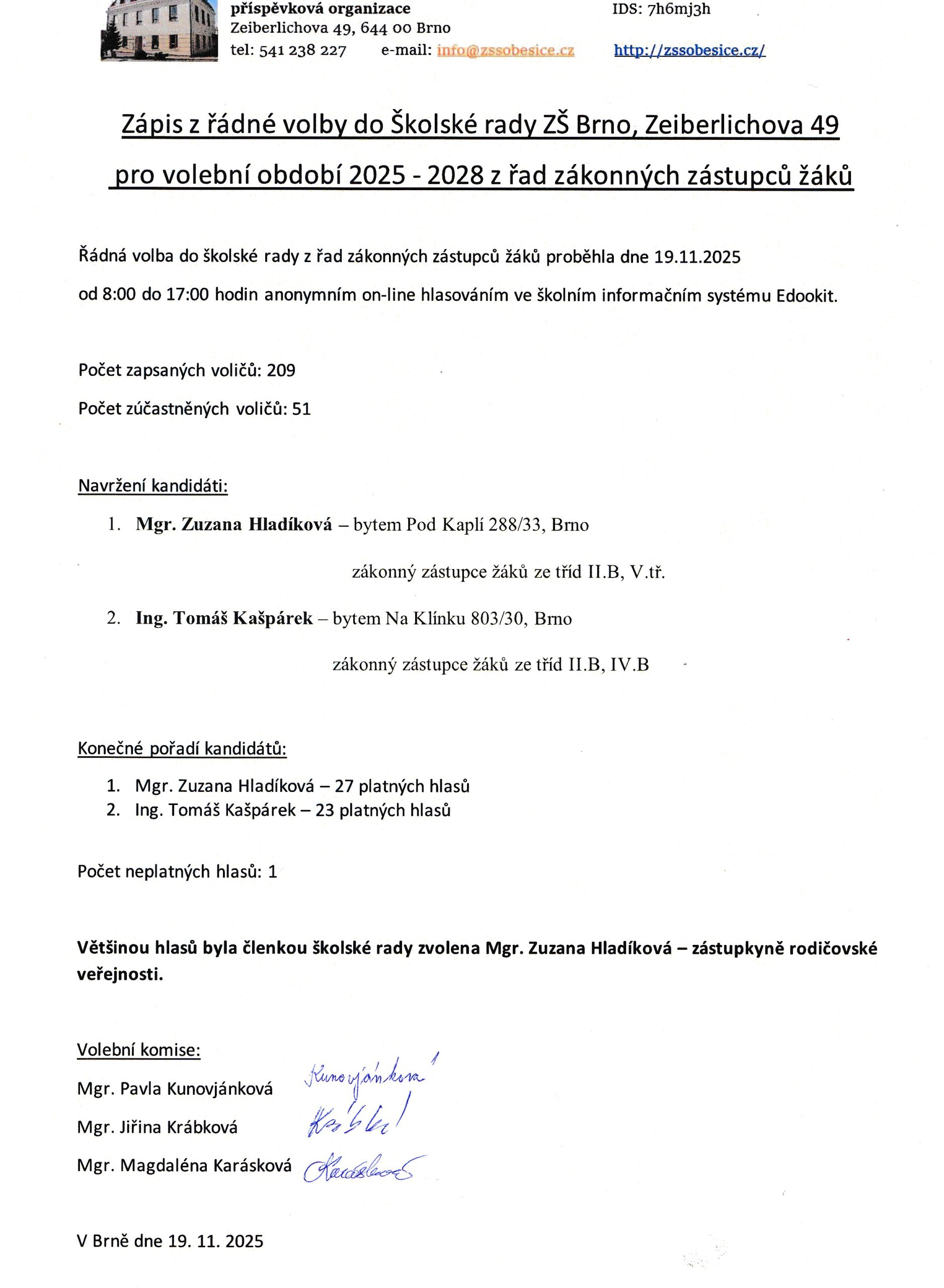 Výsledky voleb do Školské rady z řad zákonných zástupců